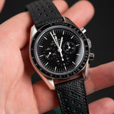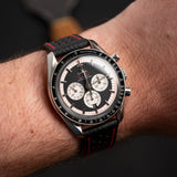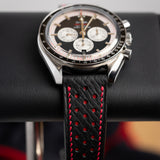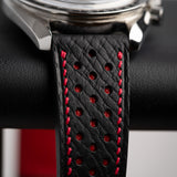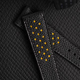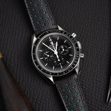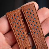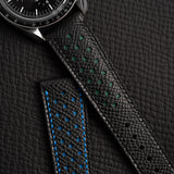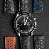 Crafted with exceptional savoir-faire, this rally leather watch strap embodies a perfect balance of elegance and sport-inspired design. Meticulously fashioned from premium Calf or Goat leather, the strap reveals a customizable underlay through delicate perforations, offering a range of vibrant colors to suit your personal style. Additionally, the fine stitching can be tailored to your preference, accentuating its sleek silhouette and lending a bold yet refined character.